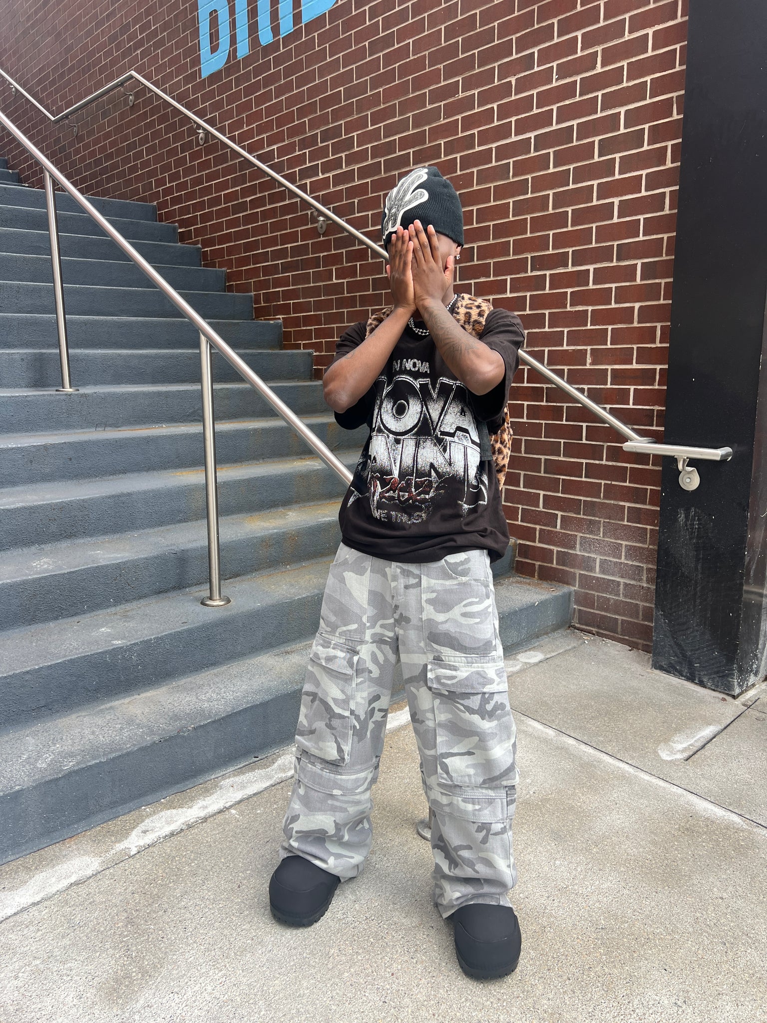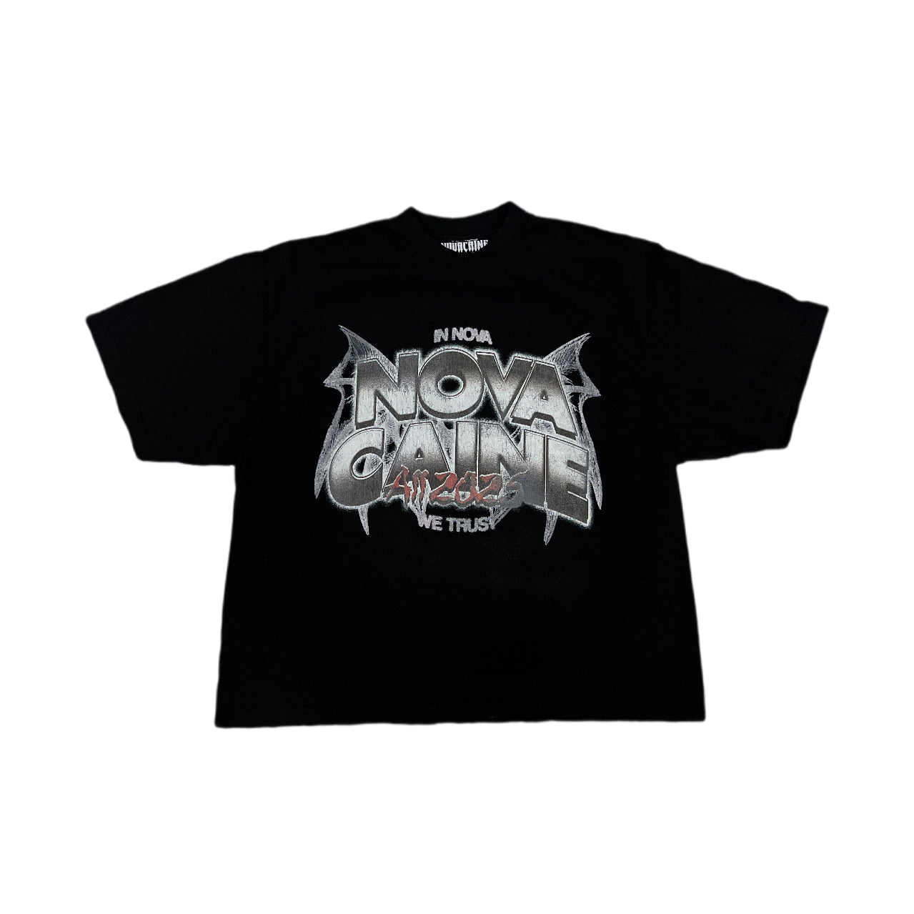 Black garment dyed drop shoulder box fit with large Novacaine Graphic